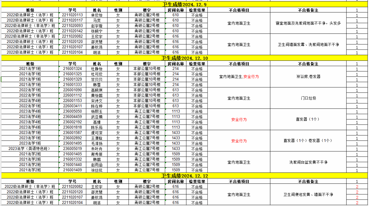 经校学生社区服务中心的检查,现对12月9日-12月13日卫生检查不合格的寝室予以公示,详见下表。