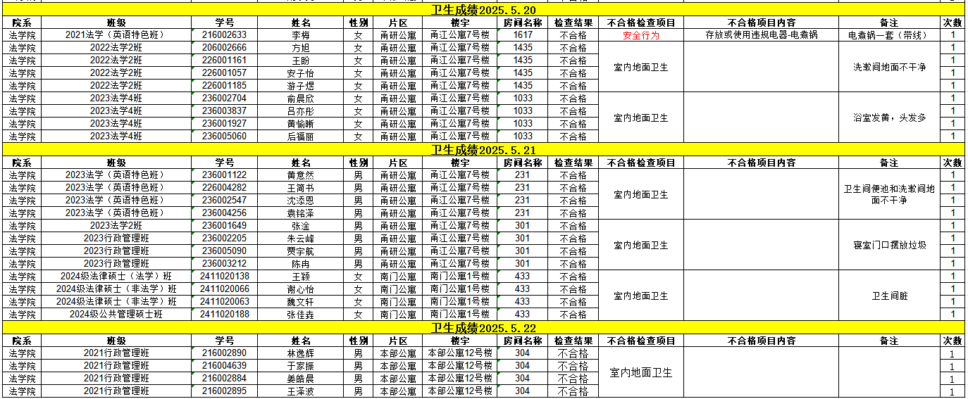 经校学生社区服务中心的检查,现对5月19日-5月23日卫生检查不合格的寝室予以公示,详见下表。