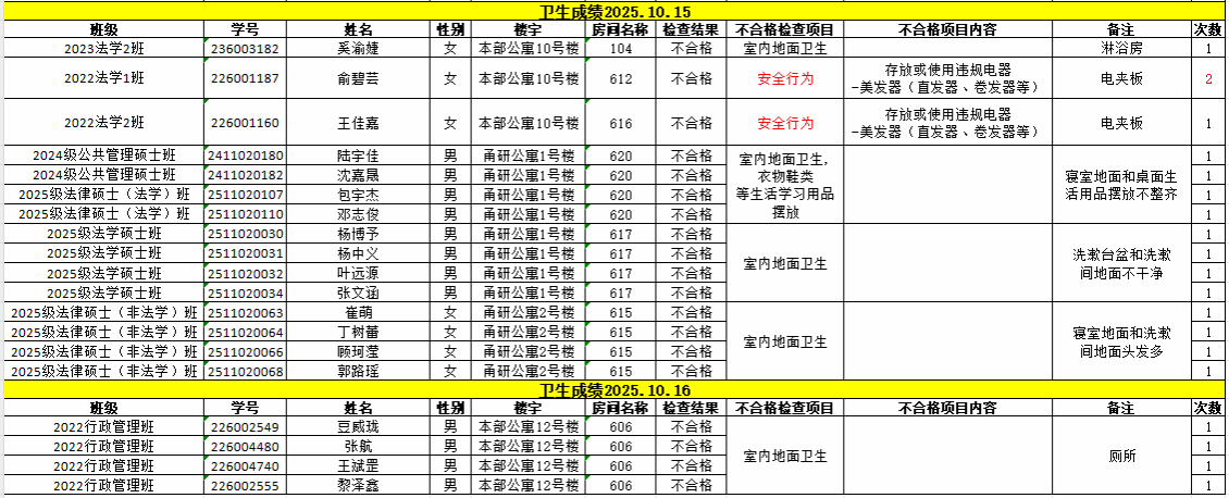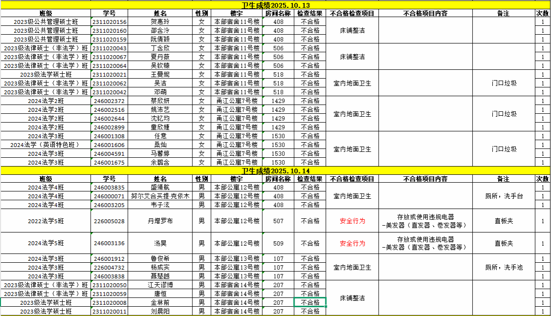 经校学生社区服务中心的检查,现对10月13日-10月17卫生检查不合格的寝室予以公示,详见下表。