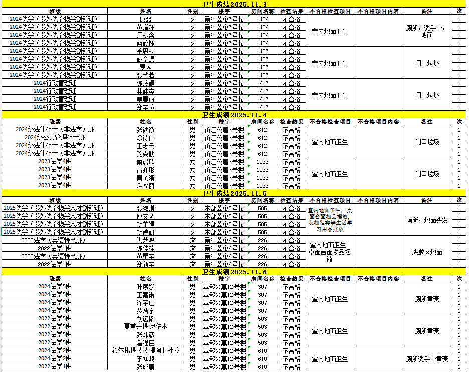 经校学生社区服务中心的检查,现对11月3日-11月7日卫生检查不合格的寝室予以公示,详见下表。