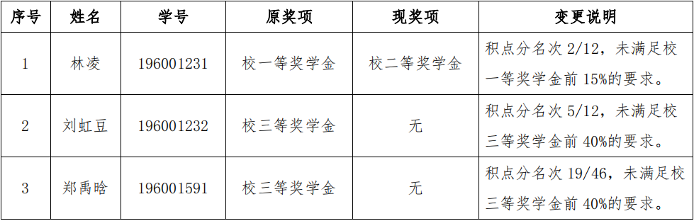 根据2020-2021学年本科学生奖学金评定工作,依据《日本av大全 本科学生奖学金评定办法》(宁大政〔2018〕84号)的相关规定,对日本av大全 2020-2021学年本科生学校奖学金拟推荐名单进行变更,具体如下: