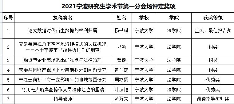 根据2021年宁波研究生学术节日本av大全 分会场奖项设置、评定及奖励办法的通知,经现场评审,结合论文盲审成绩,现将第一分会场最终评定结果进行公示: