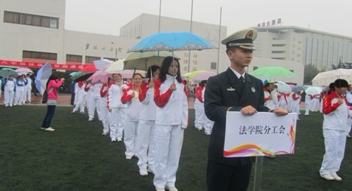 20人组成的代表队由学院党委方晓春书记带队,身着统一的运动服精神抖擞地亮相。尽管天公不作美,一直淅淅沥沥地下着小雨,但一点也没有影响大家的情绪,仍然兴高采烈地参加了展演。
