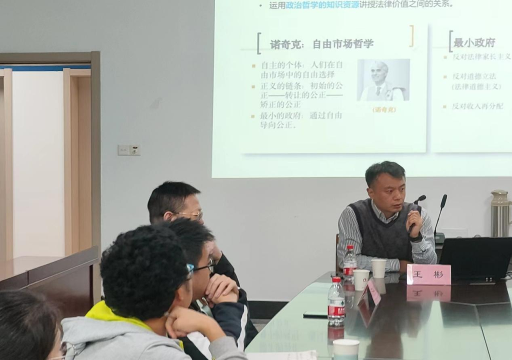 博士生导师、法理学教研室主任王彬教授为法学理论课程组带来题为《多学科融合背景下的法理学教学》的讲座。法学理论课程组部分教师和部分研究生参与了讲座。