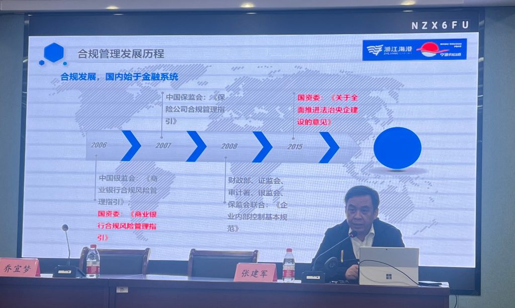讲座伊始,张主任以“中兴通讯境外合规整改案”这一典型案例引出本次讲座的主题——“国有企业合规管理”。首先,通过对近十余年合规管理发展历程的解读,张主任详细分析了国有企业合规管理的大环境。国有企业合规管理的发展始于2006年国资委发布的《商业银行合规风险管理指引》,2016年国资委组织中国石油、中国移动、东方电气集团、招商局集团、中国中铁开展合规管理试点工作,2018年国资委发布的《中央企业合规管理指引<试行>》正式拉开了央企合规建设的序幕,合规管理政策在2022年升级为《中央企业合规管理办法》。为响应中央企业合规管理建设号召,浙江省将国企合规管理建设作为本年度省属企业法制建设的重点工作,全力推动省属企业的合规管理体系建设工作。