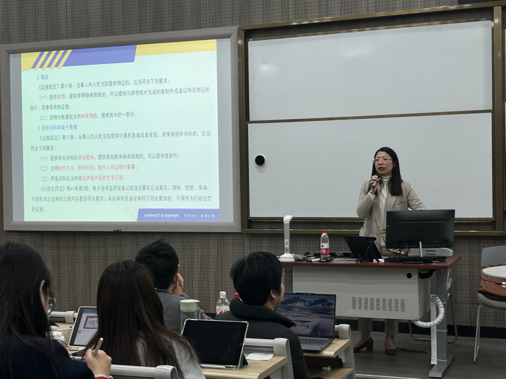 苏爽律师以一系列热点案件入手,通过自己在行政诉讼证据的实务经验,着重介绍了证据材料、证据效力、证据能力等与证据相关的概念,启发同学们可以从行政机关和法院两种不同的视角去看待事实问题。本次授课内容深入浅出,得到了现场教师和同学们的认可。