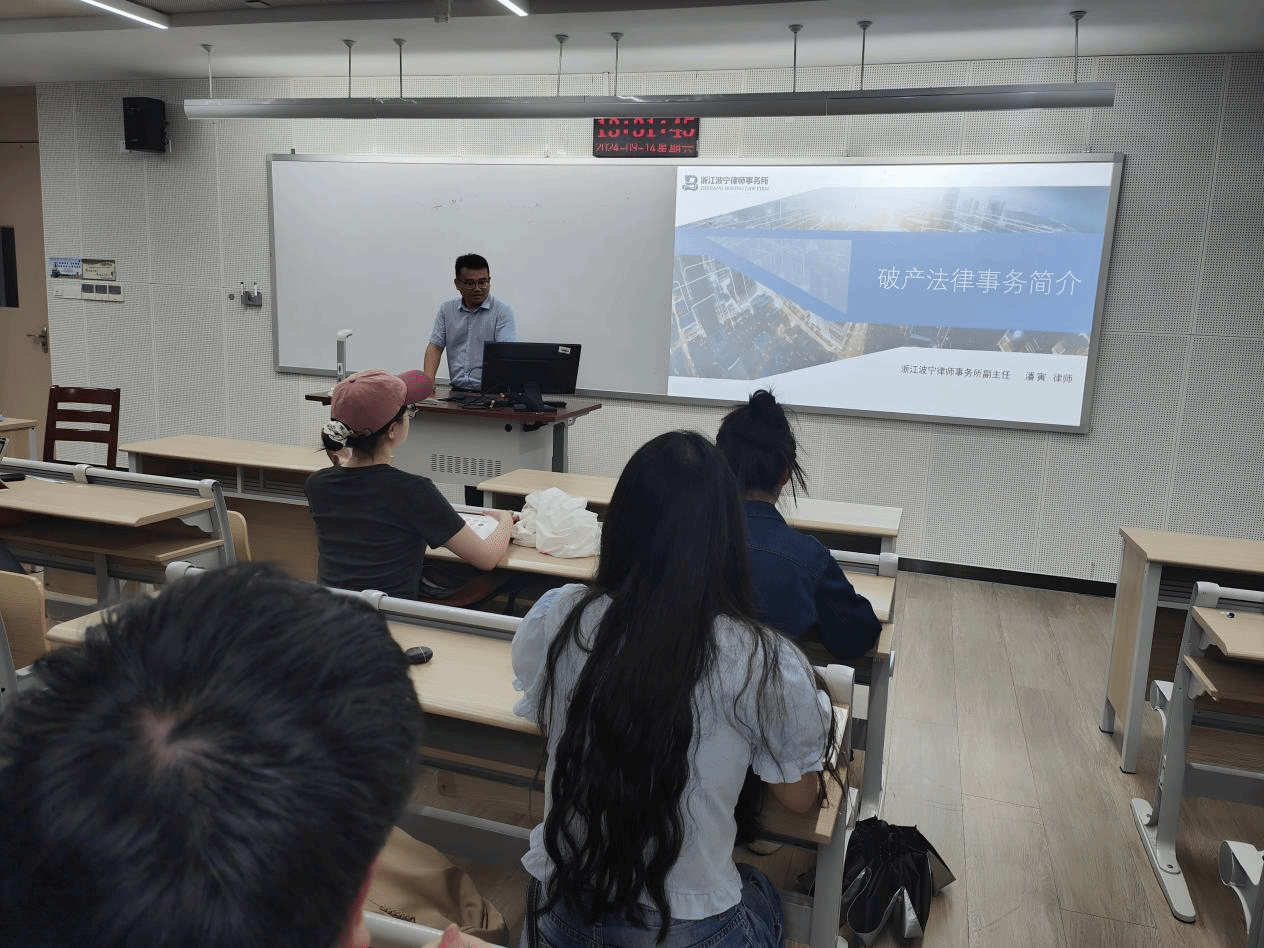 2024年9月14日下午,浙江波宁律师事务所副主任潘寅律师走进破产法课堂,向学生分享破产管理人的日常工作,用鲜活案例介绍破产管理人的任职资格、选任、职责,也讲述了破产管理人履职不当时可能承担法律责任的案例。同学们在学习破产法律理论知识的同时,也了解了一类法律职业工作,丰富了同学们未来的就业选择。