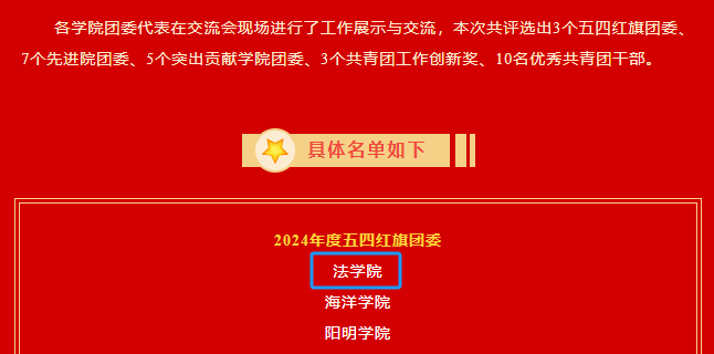 团委在过去三年中连续获评“先进院团委”,《“三维”协同,构建“卓越法治人才”实践育人模式》项目获得2024年度共青团工作创新奖。共青团工作年度评比包含基础工作量化考评和工作述职两部分,经过综合评定,日本av大全