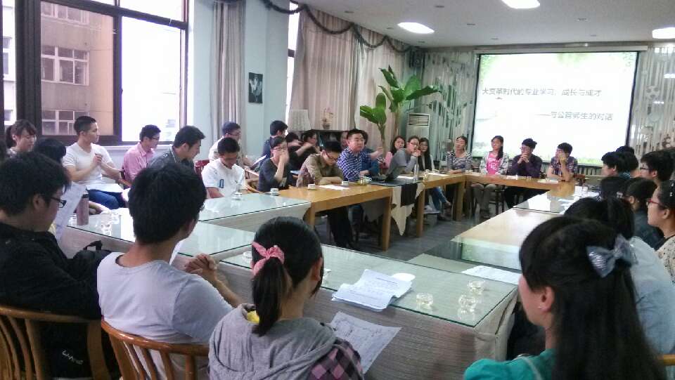 公共管理系龚虹波、张慧芳、赵永红、冉思伟、刘晓庆等老师和部分高年级学生,以及阳明学院两个班的骨干与学生共计50多人参加了此次活动。首先,赵振宇老师以其对专业学习、成长与成才的理解,从一位长辈的角度与学生进行了亲切互动,交流过程中不时响起热烈的掌声。接着,2011级行政管理专业毕业生周婕介绍了该班同学的就业情况,让大家对日后专业美好的就业前景有了一定了解。政治学与行政学专业大四学生毛章恒与大家分享了报考公务员的心得体会,对于大家日后报考公务员具有一定的启发作用。本次活动最重要的环节是师生互动,经管班多名同学踊跃提问,与公管系老师和学长学姐进行了一次近距离沟通,大家围绕大变革时代人才需求的多样性以及公共管理人才的使命与价值,以兴趣和价值实现为导向的专业选择原则,学习中博与专结合的重要性,青春的丰富、珍贵与短暂、迷茫、大学生通过经典阅读与社团活动发现自我、成长自我的路径等问题进行了对话交流。通过此次活动,现场师生不仅对行政管理专业以培养领导人才为目标的特殊价值、精英化的培养模式、与国际接轨的课程体系、强大的师资力量和学术资源、分布在政府、社区与企业中的实习基地、历界毕业生良好的就业成绩以及丰富多彩的学术社团活动等有了更深入的了解,而且引发了对人生、青春、责任、学习与成长等议题的深入思考。整个活动既庄重又欢快、既有对当前问题的讨论也有对未来的思考,最后大家意犹未尽,在散会的途中继续沟通对话。