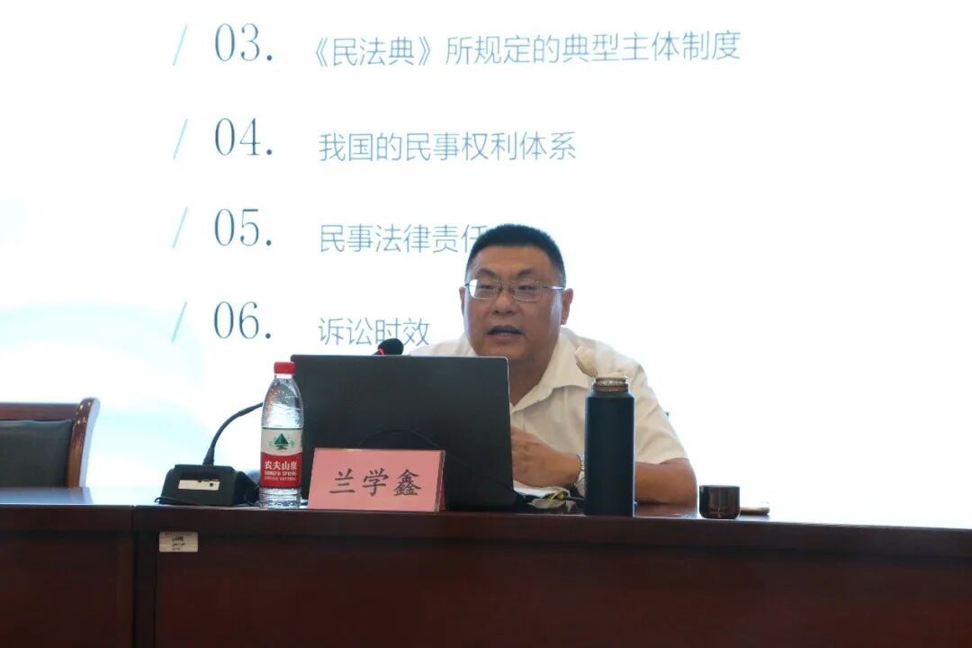 讲座伊始,兰主任从《民法典》的立法历程谈起,系统梳理了我国民法典编纂的宏观背景和制度脉络。他指出,《民法典》作为“社会生活的百科全书”,其总则编不仅奠定了全典的逻辑基础和价值导向,更体现了新时代中国民事法治的制度自觉。随后,兰主任带领大家依次回顾了总则编的十章内容,涵盖基本规定、自然人、法人、非法人组织、民事权利、民事法律行为、代理、民事责任、诉讼时效与期间等核心制度。他不仅从条文体系和制度逻辑上展开讲解,还穿插了自己在司法实务与咨询服务中的切身体会。