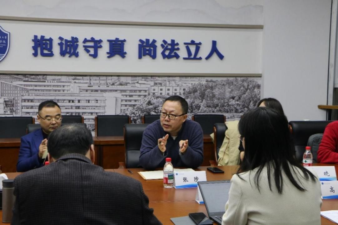 副院长王婉娟对外国语学院教师一行的到来表示欢迎。外语学院副院长张陟介绍了外国语学院在翻译与跨文化交际方面的专业特色,并表达了对两院合作培养复合型人才的期待。法律系主任谢晓彬系统阐述了涉外法治人才协同培养创新基地的建设进展中的重难点,并详细解读了培养方案与课程体系。