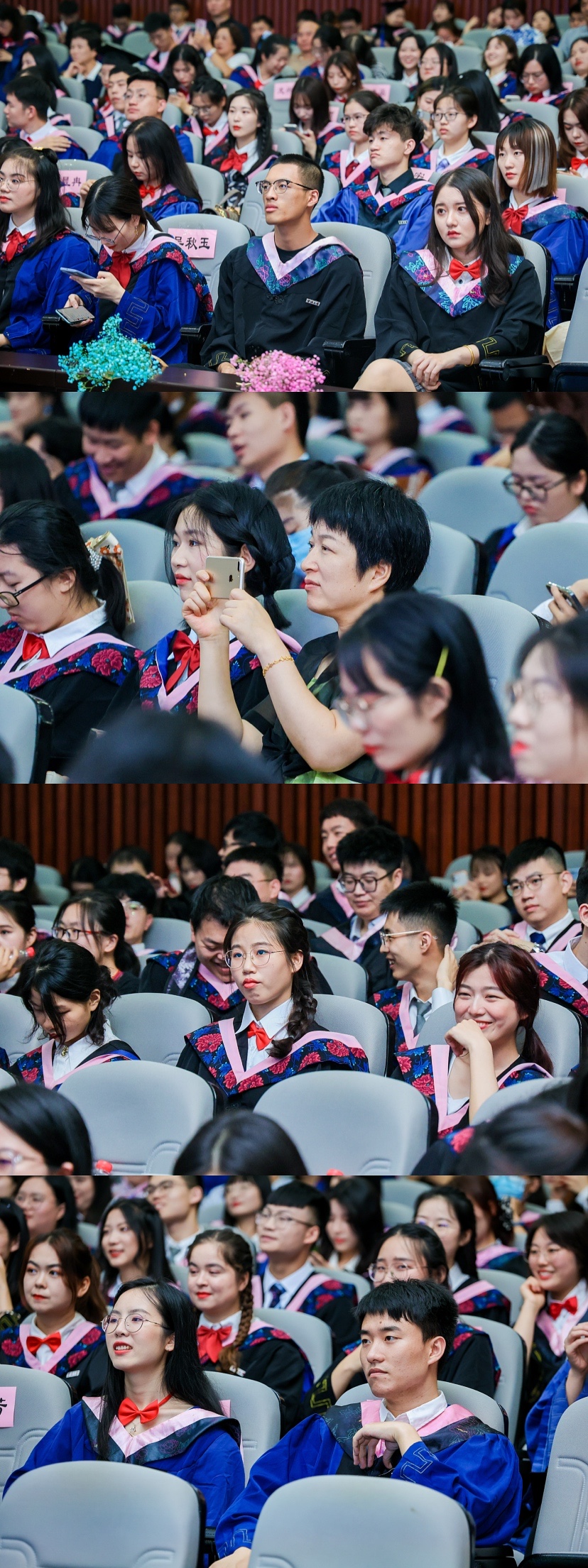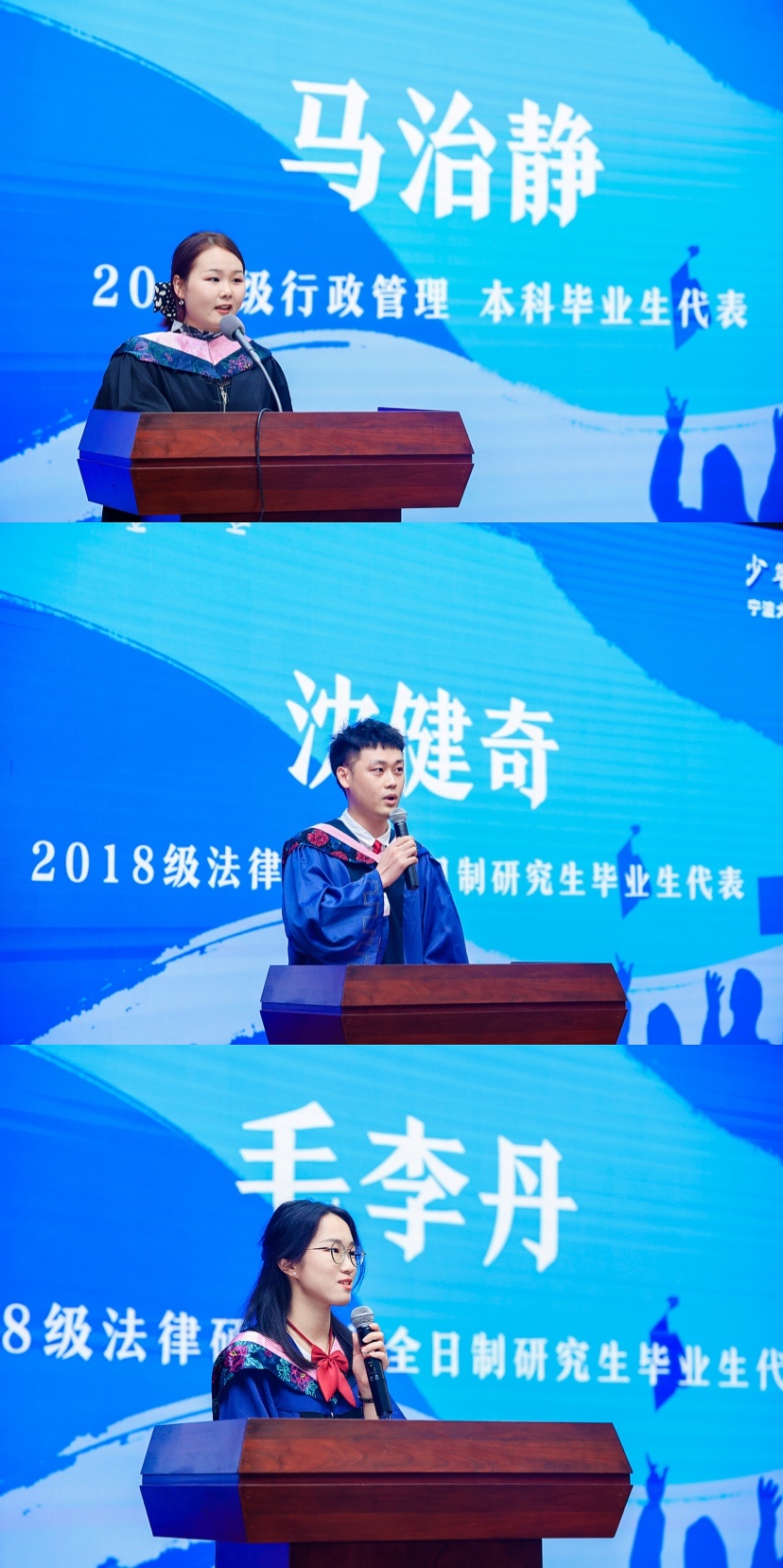 接着,本科生毕业生代表马治静、全日制研究生毕业生代表沈健奇、非全日制研究生毕业生代表毛李丹分别上台致辞,感谢母校的栽培,感谢恩师的教导,回忆同窗的点滴,并表示会继续努力,为学院为学校争光。典礼上还专设了“感恩”环节,毕业班班长代表全班同学为学院教师代表献上了感恩的鲜花。