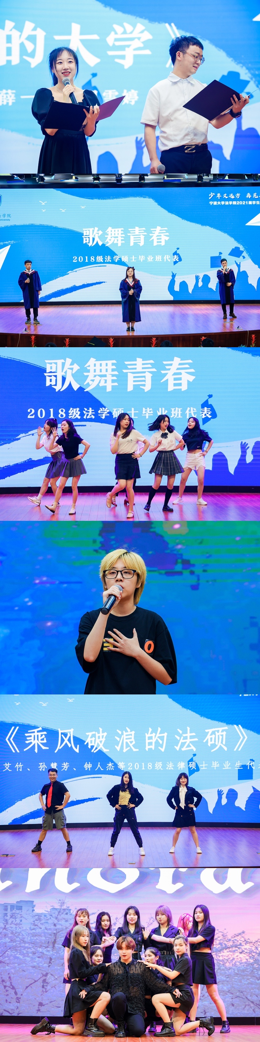 欢送会中,2017级行政管理班、2018级法律硕士班、2018级法学硕士班、2017级法学专业毕业生代表等纷纷带来精彩的演出,用青春的舞姿、动听的歌声、深情的朗诵,谱写和镌刻属于自己少年旋律。