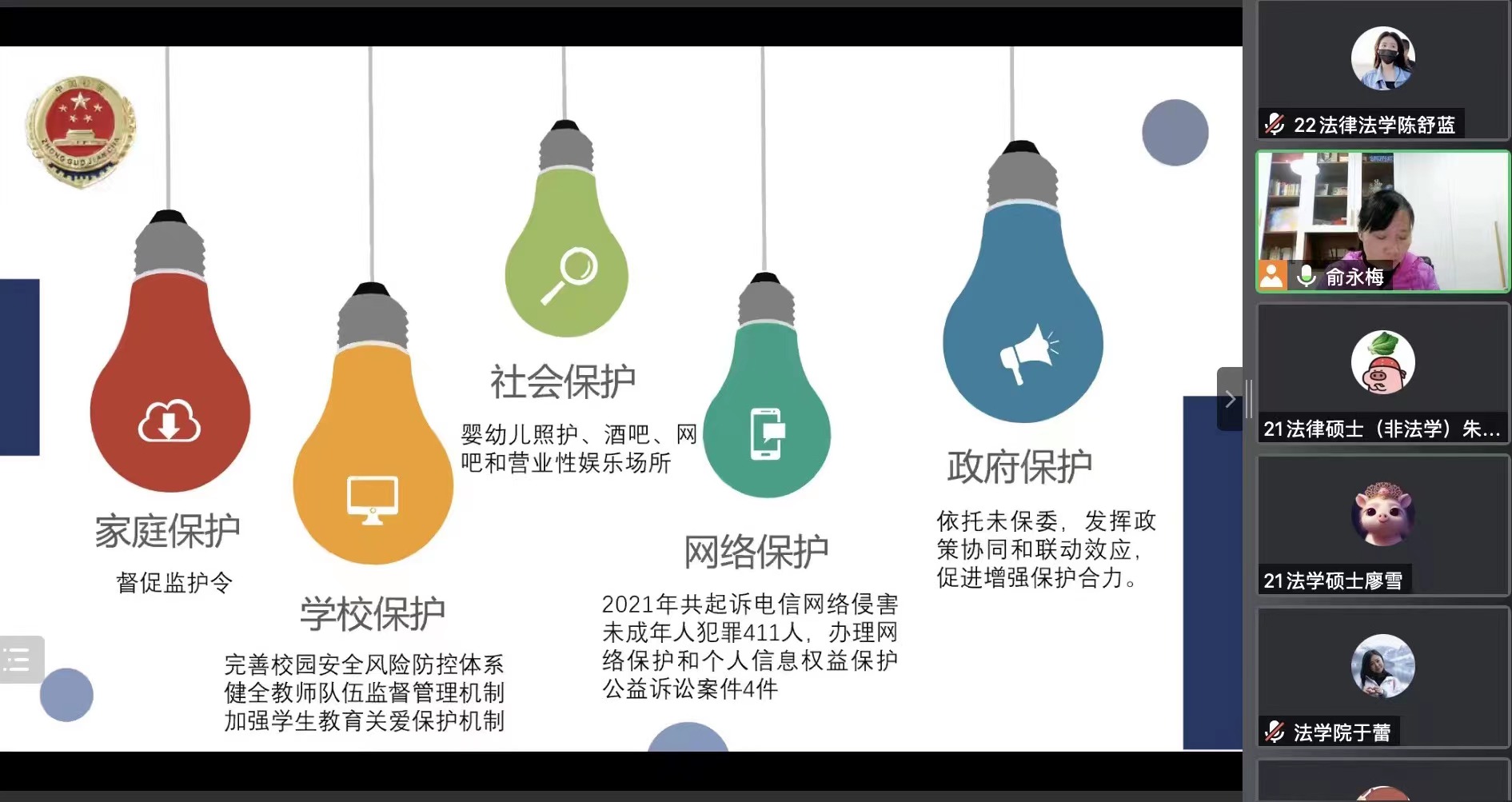 12月14日晚,研究生法治讲座以司法守护“少年的你”——未成年人检察业务概述在线上会议顺利举行。讲座由宁波市人民检察院第七检察部主任俞永梅主讲,由日本av大全