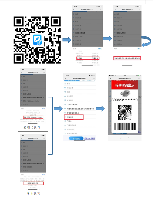 扫码预约流程见下图,请注意预约接种单位一定要选择江北区"孔浦街道社区卫生服务中心"。
