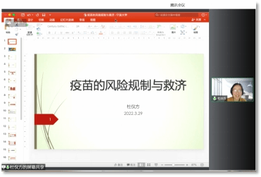 随后,杜老师向大家展示了世卫组织在2020年4月的海报图,介绍疫苗对群体防护防疫的重要性。杜老师向我们介绍了风险概念以及风险防护,风险包含了不确定性,风险的发生具有一定的概率。杜老师以“疫情防疫”为例,对疫苗的风险与规制进行了概述,向大家阐释了风险中政府决策以及预防原则,由此引出了疫苗的责任分担,疫苗的责任包含民事赔偿责任、国家赔偿责任、补偿责任;救济的方式有补偿和赔偿。杜老师对于目前风险领域的责任分担发表了自己的看法,她认为行为主体与责任主体分离,故我国的救济制度设置需要从私立救济走向社会共担。